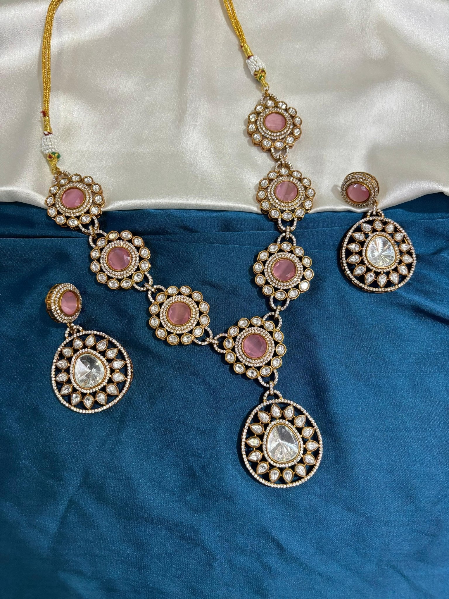Lacy Silver Foil polki stone Necklace set (Pink)